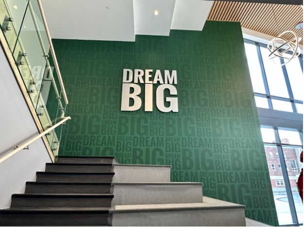 We printed and installed a 25-foot high textured vinyl graphic that reads “Dream Big” on the large wall over the social staircase. Plus, 3.5-foot large "Dream Big" silver dimensional letters stand off the wall by 1.75 inches, casting a dramatic shadow on top of the vinyl graphic.