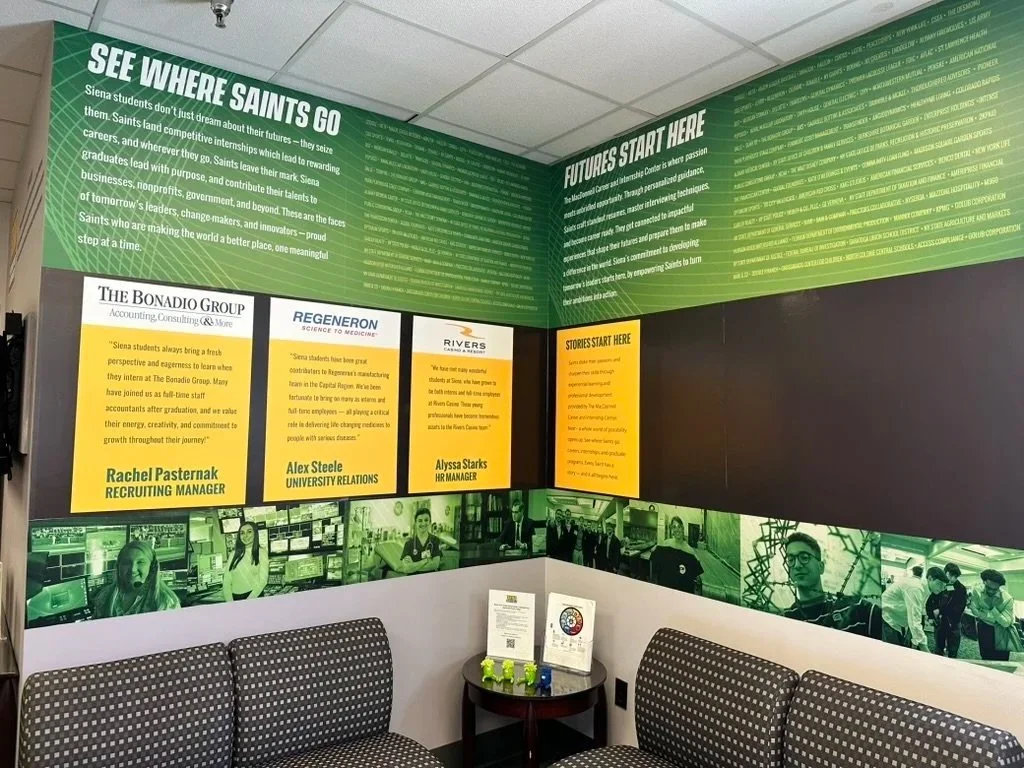 The Career Center was looking for a solution for students to proudly show off their new job they obtained thanks to Siena. We installed Vinyl graphics and a magnetic wall where Siena can replace partner companies that employ Siena graduates. We also provided magnetic material for students to hang selfies of them at their new jobs.